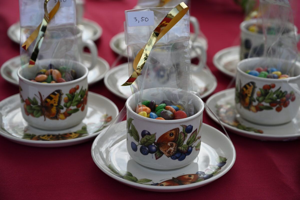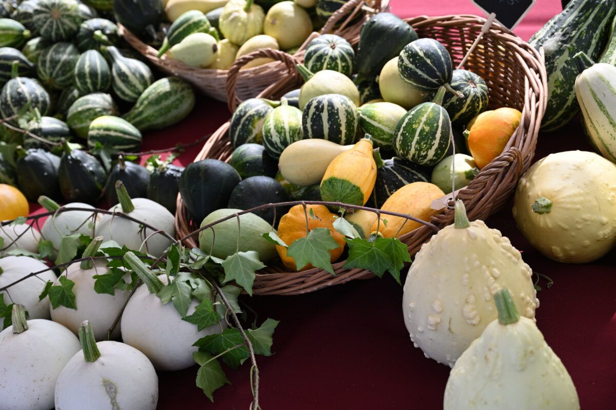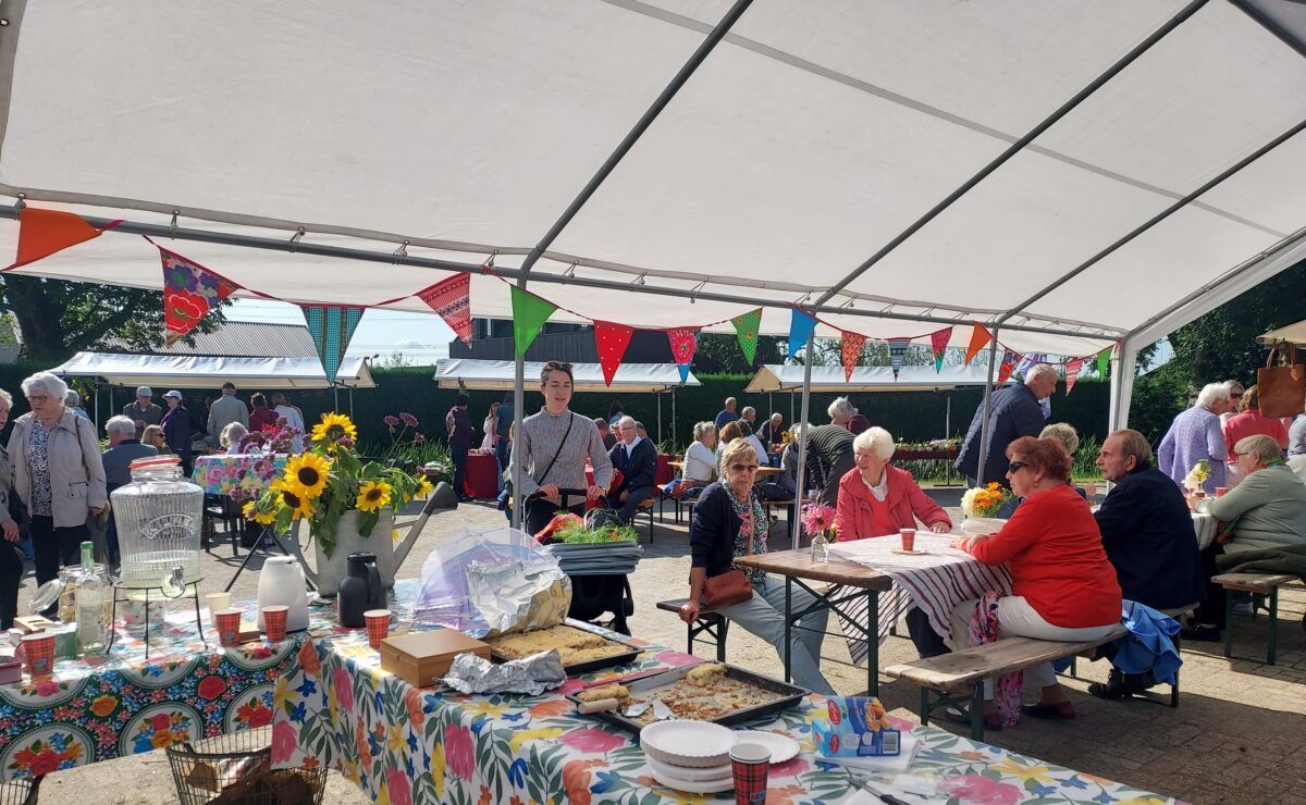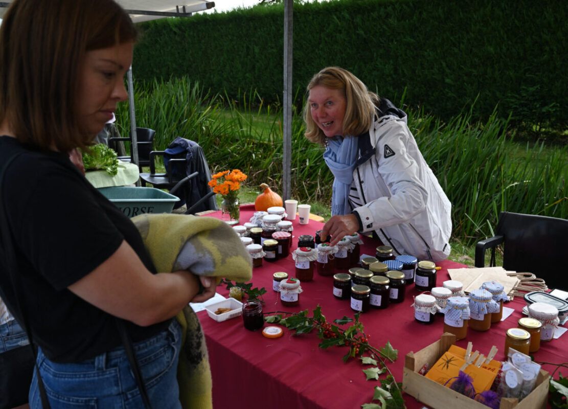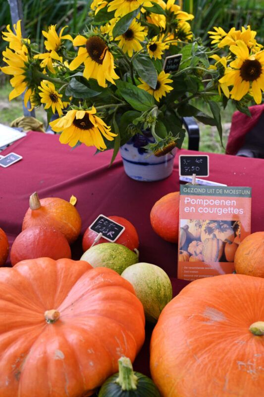 De Oogstmarkt 2024 was met ruim 300 bezoekers weer een druk bezocht, gezellig en geslaagd evenement. Het was bovendien een mooie, zonnige nazomerdag. Klokslag 10.00 uur gingen de hekken open en mochten wij de eerste bezoekers ontvangen. Naast een catering met koffie, thee, frisdrank, een keuze uit verschillende heerlijke taarten en een verrukkelijke pompoensoep, konden onze bezoekers terecht bij fraai ingerichte kramen met groenten en aardbeienplantjes, pompoenen en kalebassen, bloemen en schilderijtjes met gedroogde bloemen, brocante, boeken, servies en glazen en natuurlijk jam, chutney en zoetzuur. De voor het tweede opeenvolgende jaar ingerichte kinderhoek was opnieuw een succes, met kinderen die onder het genot van een vlierbessendrankje en een cupcake heerlijk aan het knutselen sloegen. Bij de entree konden bezoekers voor een klein bedrag het gewicht van een grote pompoen raden. En de winnaar is Trudi van Dorssen uit Muiderberg. Zij raadde het juiste gewicht: 8,3 kg (zie eerste foto).